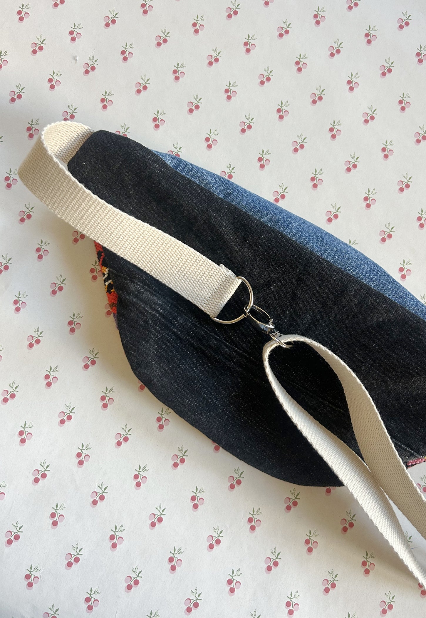 Each bag is a completely unique upcycled creation made from vintage French needlepoint  and vintage denim jackets.