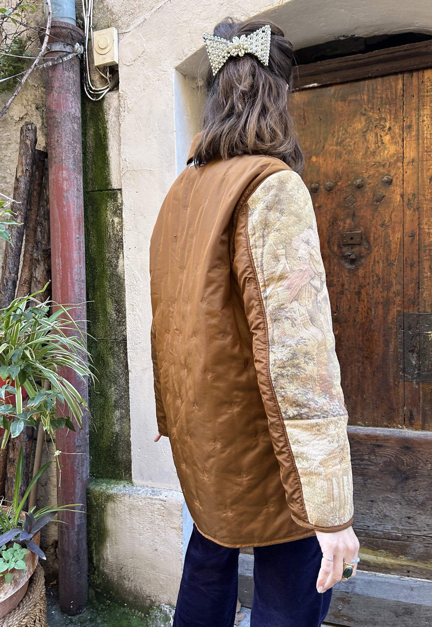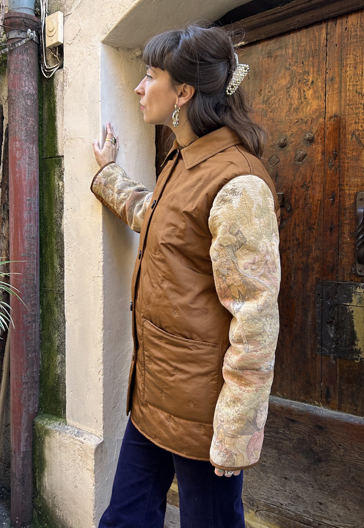 the Upcycled Quilted Horse Jacket infused with the beauty of French Vintage Needlepoint. A sustainable fashion statement that honors heritage, style, and our planet.