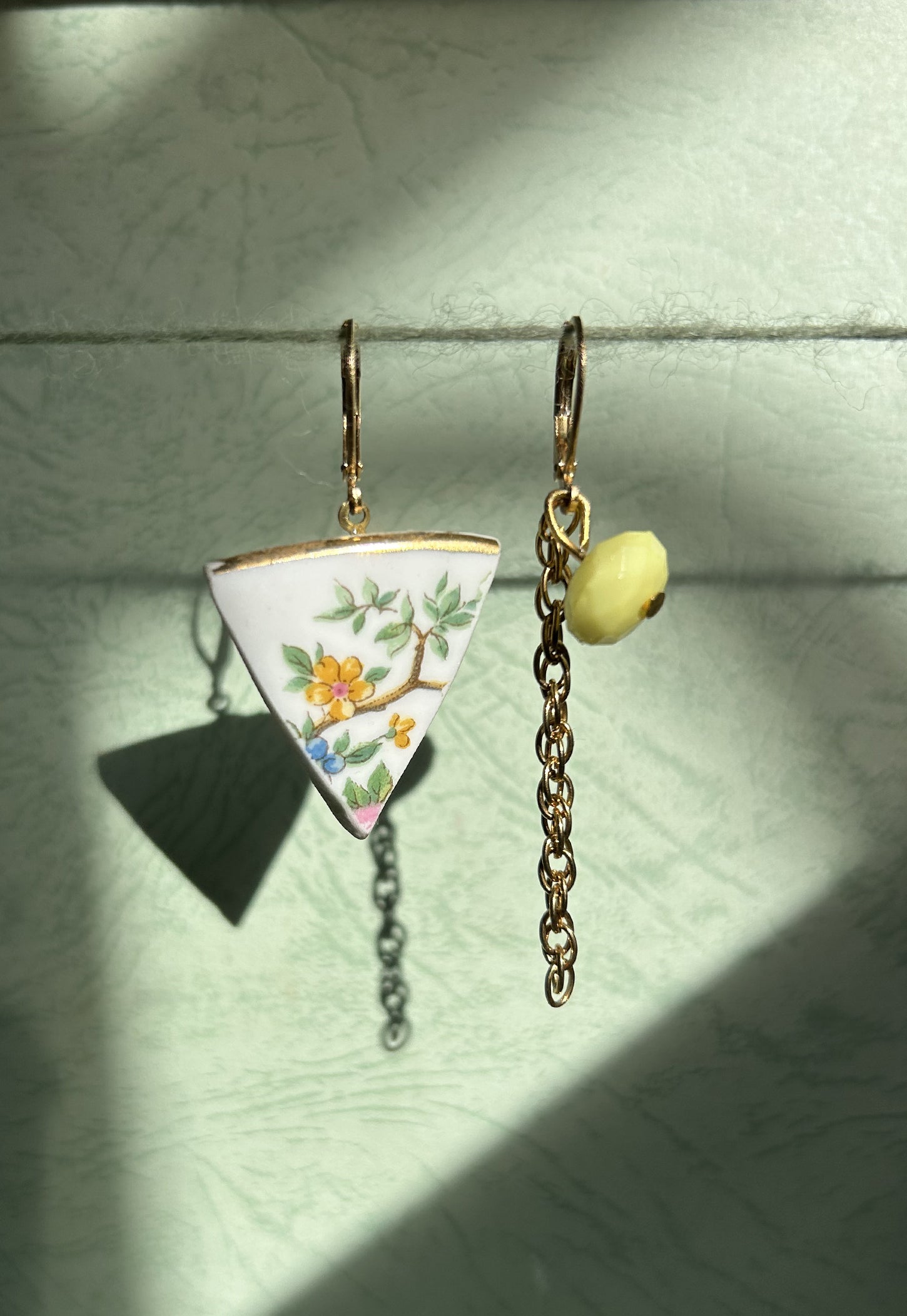 Unique pair of asymmetric earrings made from pieces of vintage broken teacup and vintage jewelry.