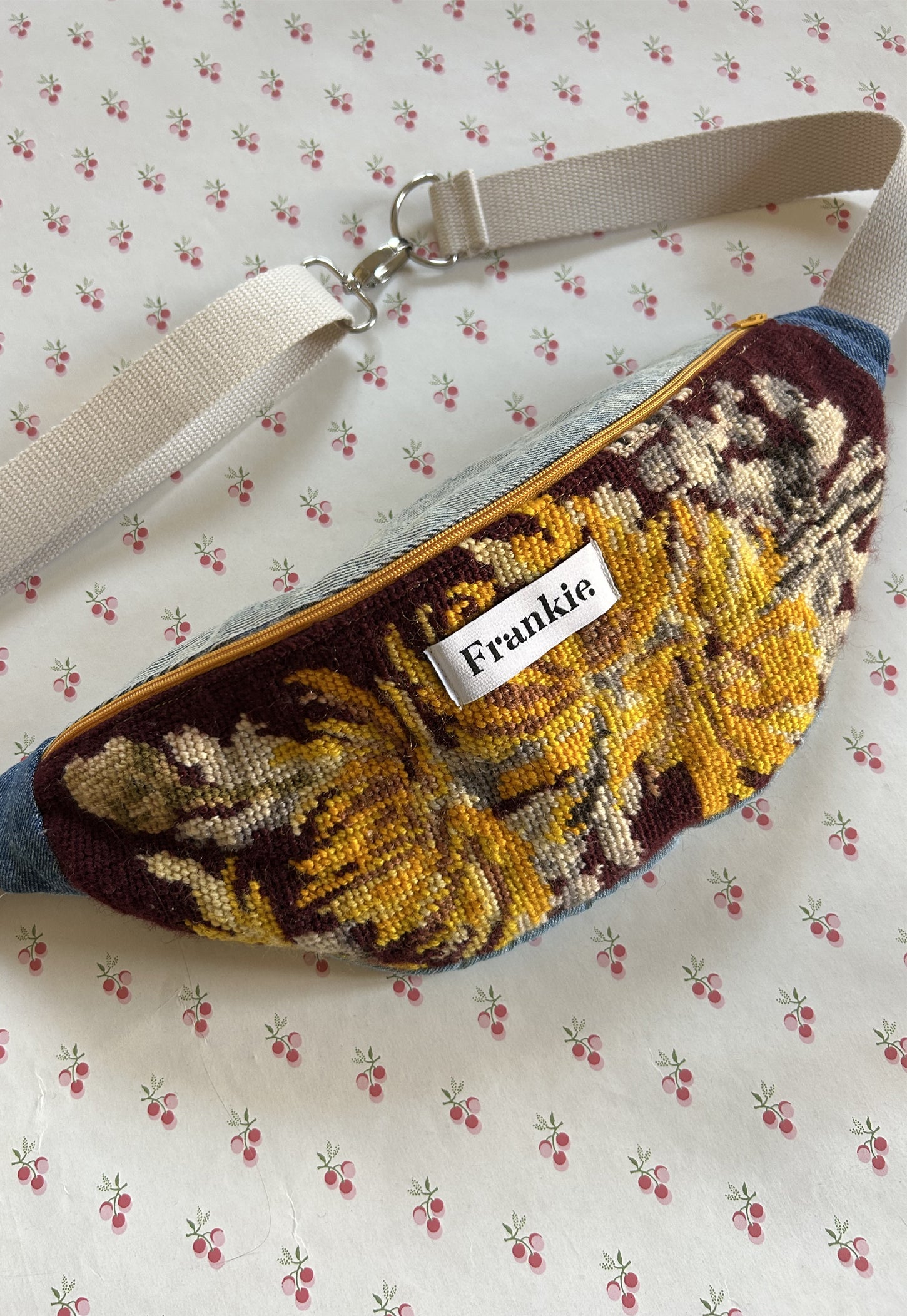 Each bag is a completely unique upcycled creation made from vintage French needlepoint and vintage denim jackets.