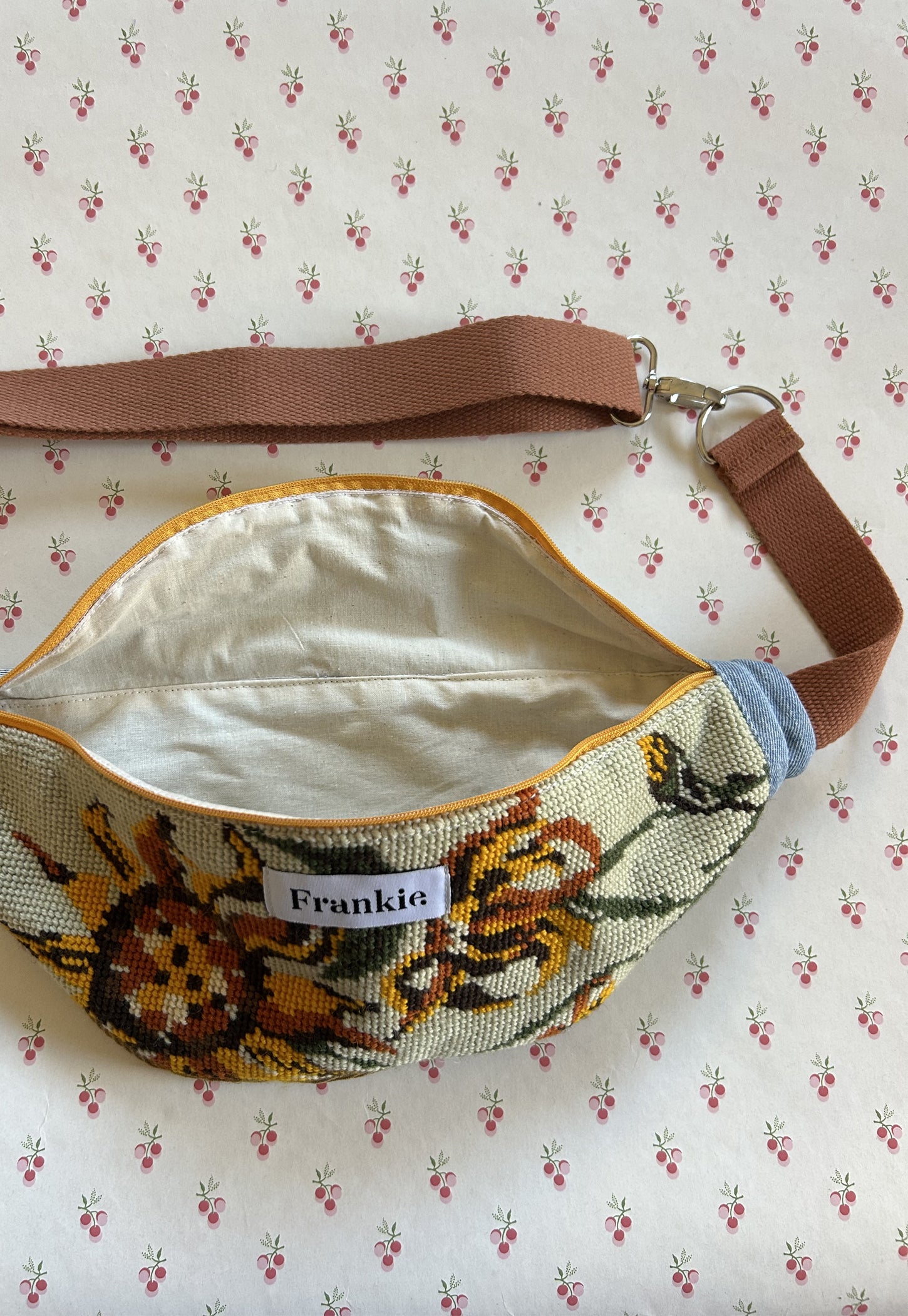 Each bag is a completely unique upcycled creation made from vintage French needlepoint and vintage denim jackets.
