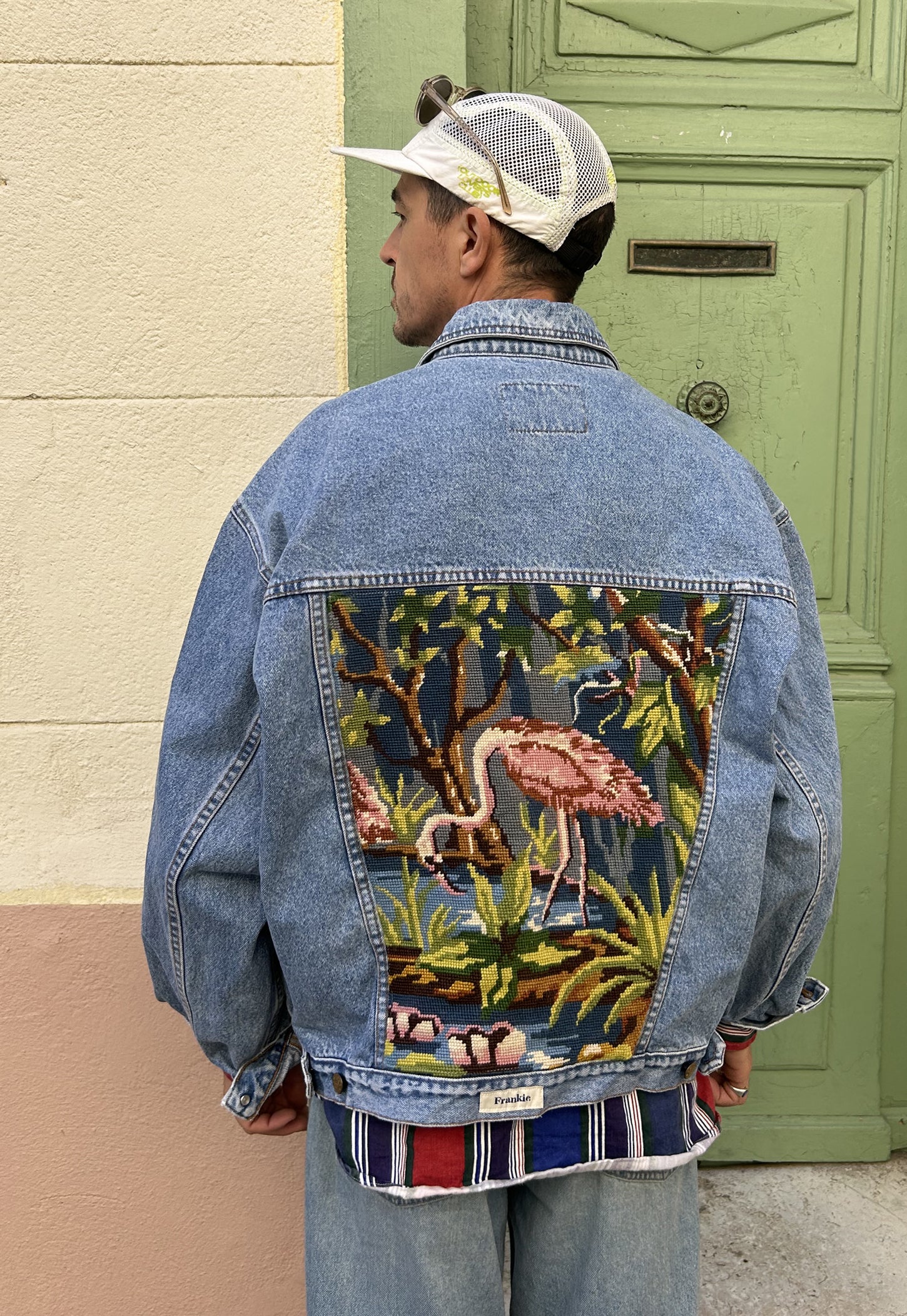 All denim is purchased vintage in U.K, France or Italy and tapestries are sourced in France in Antique markets.