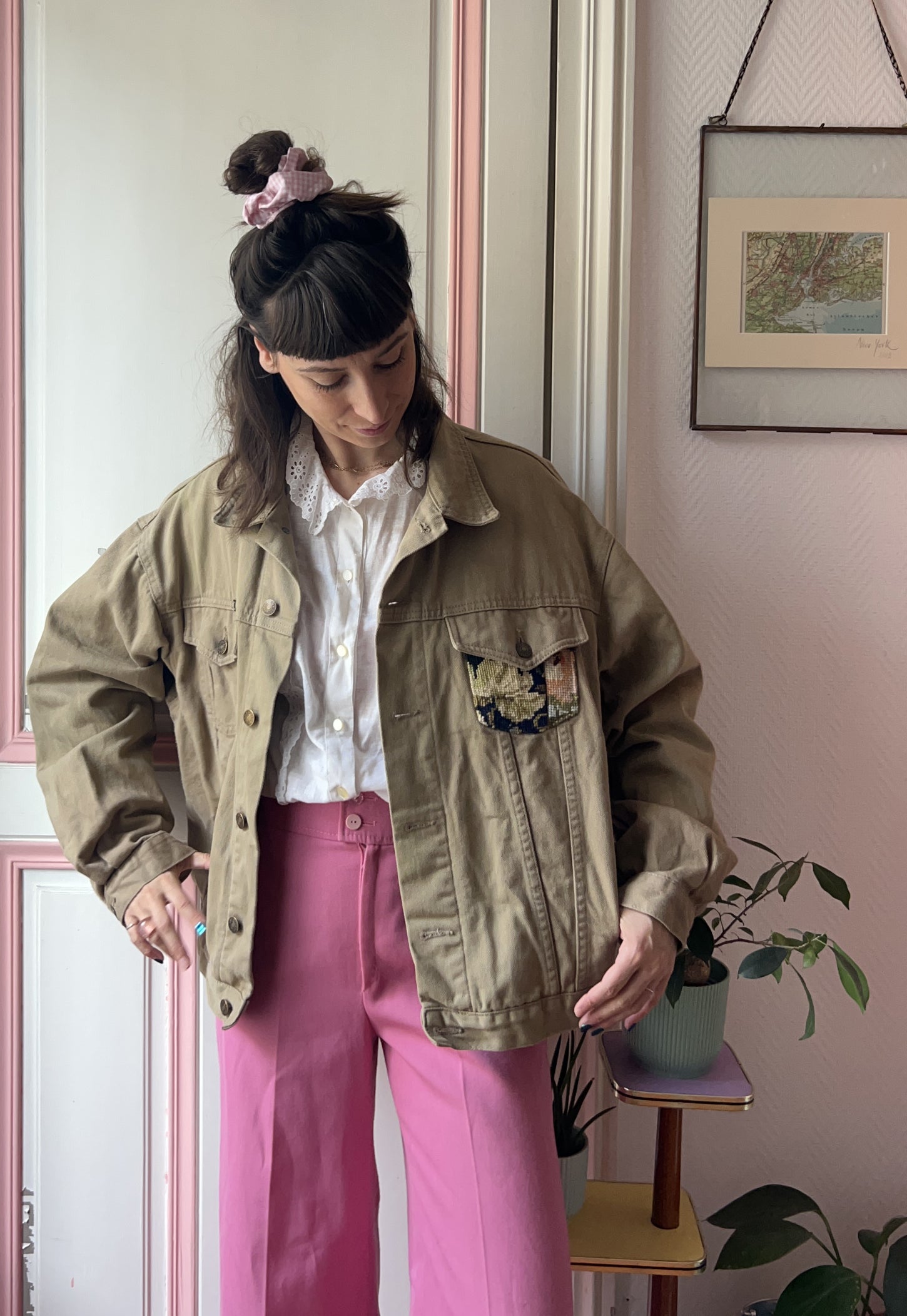 Vintag upcycled denim jacket , 100% Cotton, beige/ kaki